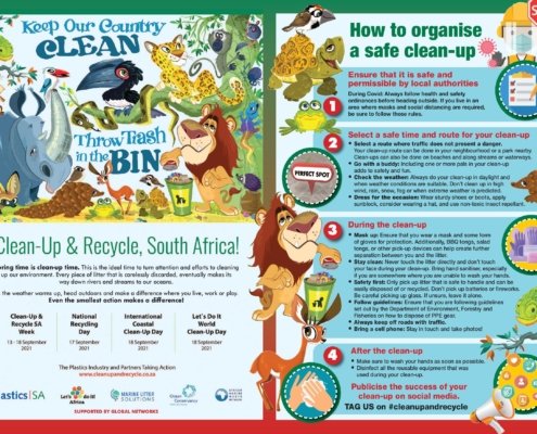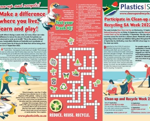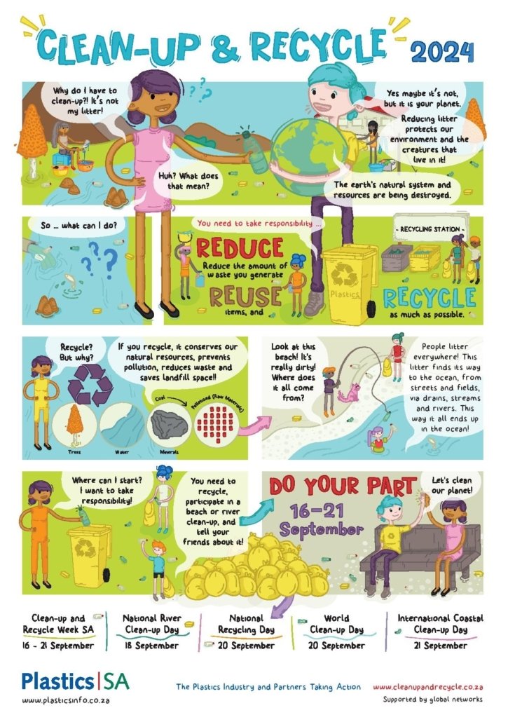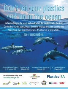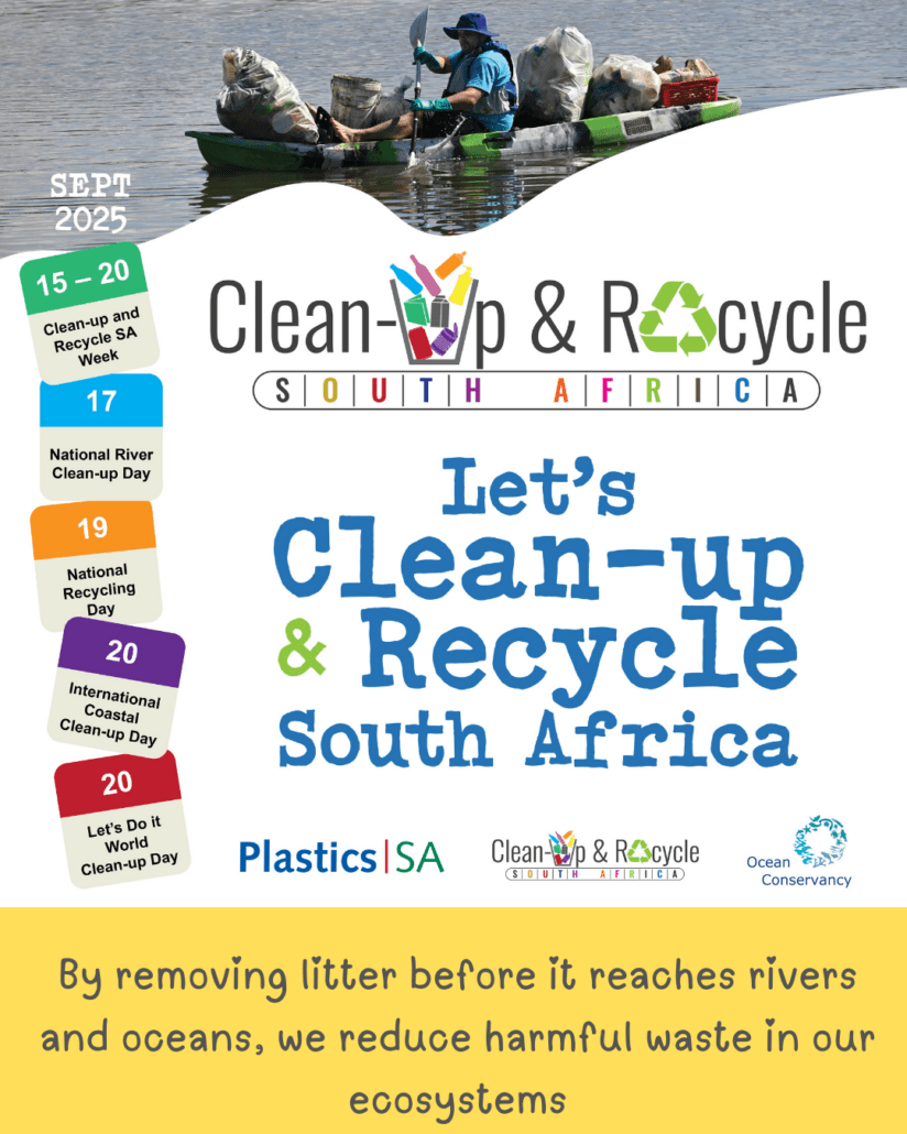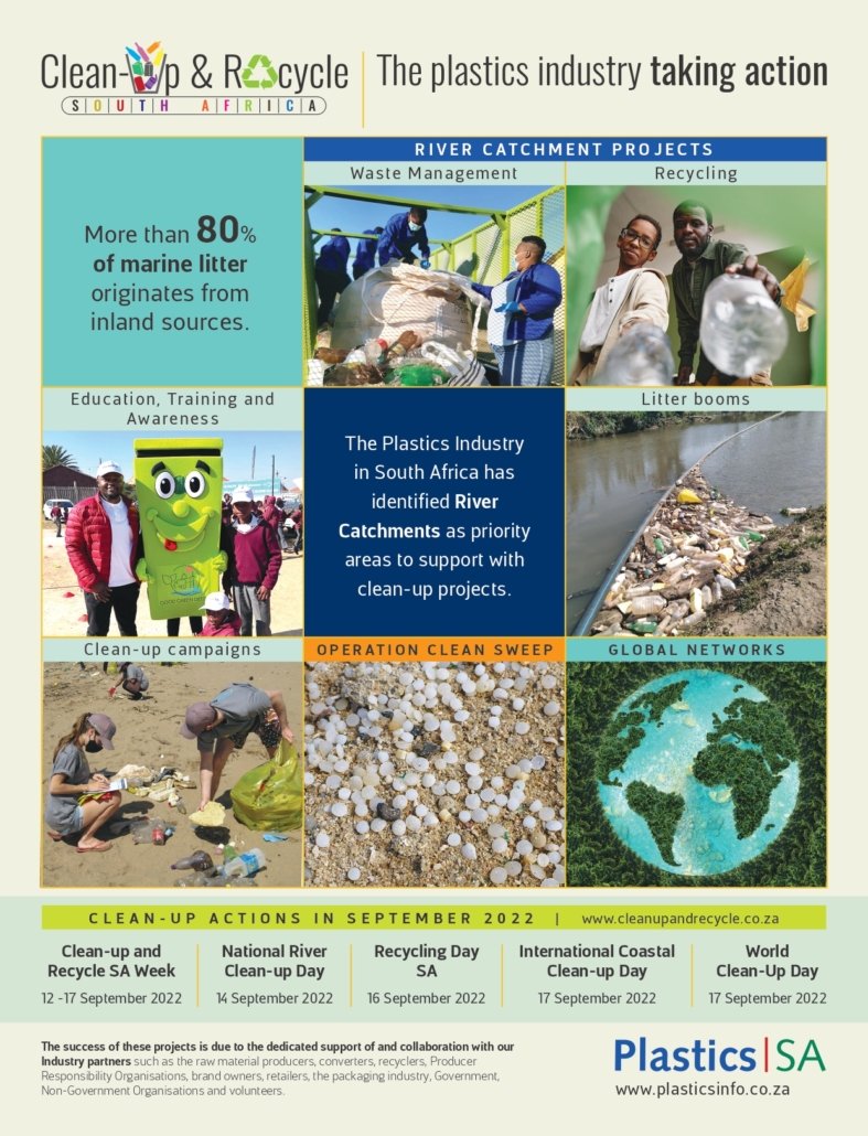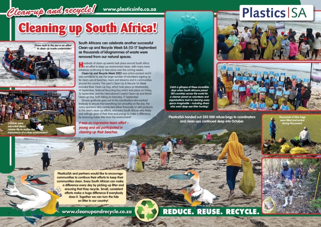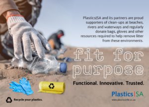 Each year, the local plastics industry encourages citizens to make a difference where they live, work, learn or play by participating in clean-ups around the country, throughout the year, but especially during Clean-up and Recycle SA Week – an annual public awareness week during which plastics and other litter are removed from our country’s neighbourhoods, rivers, streams, beaches and oceans.