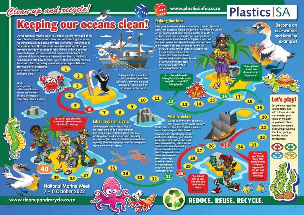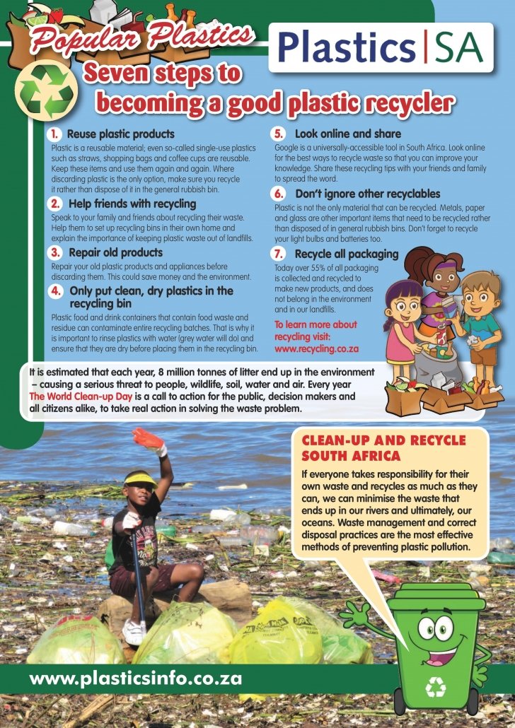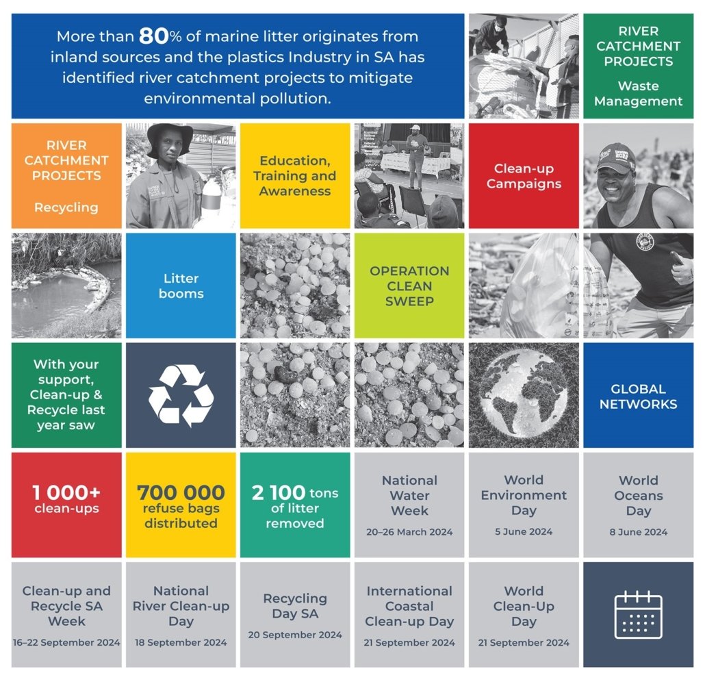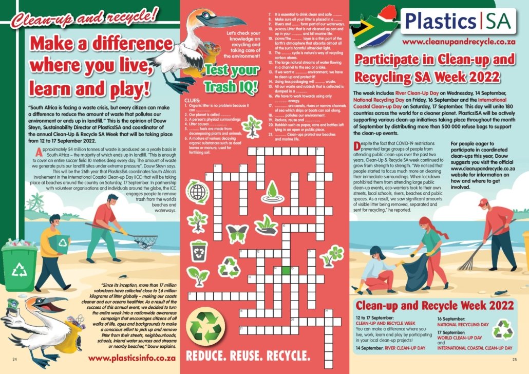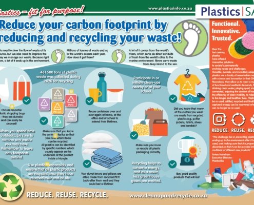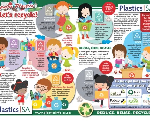 Each year, the local plastics industry encourages citizens to make a difference where they live, work, learn or play by participating in clean-ups around the country, throughout the year, but especially during Clean-up and Recycle SA Week – an annual public awareness week during which plastics and other litter are removed from our country’s neighbourhoods, rivers, streams, beaches and oceans.